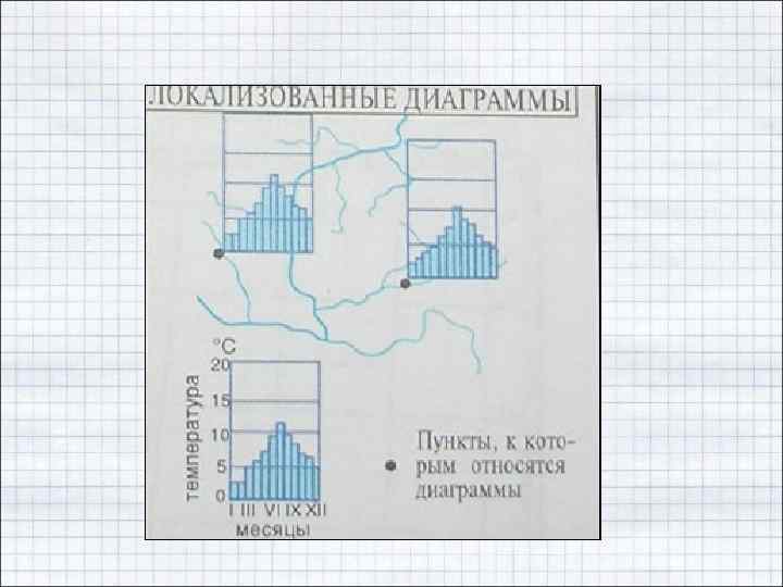 способ локализованных диаграмм (diagram map) - изображение явлений, имеющих сплошное или полосное распространение, с помощью графиков и диаграмм, помещенных в пунктах наблюдения (измерения) этих явлений (напр. , графики изменения среднемесячных температур и осадков, локализованные по метеостанциям, диаграммы загрязнения речных вод, приуроченные к гидропостам);