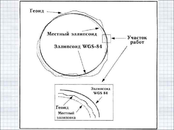 • Модель эллипсоида вращения имеет больше характеристик: размеры большой и малой полуосей, а также положение центра и ориентация осей эллипсоида относительно оси вращения Земли. • Для более точного описания фигуры Земли используется понятие геоида или основной уровенной поверхности.