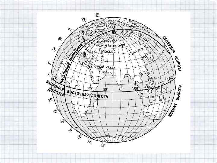 • Экватор (от лат. aequator - уравнитель) - линия сечения земной поверхности плоскостью, проходящей через центр Земли, перпендикулярно оси ее вращения. Делит земной шар на Сев. и Юж. полушария. Служит началом счета широты • Положение точки на поверхности сферы определяется двумя сферическими координатами - широтой(φ) и долготой(λ)