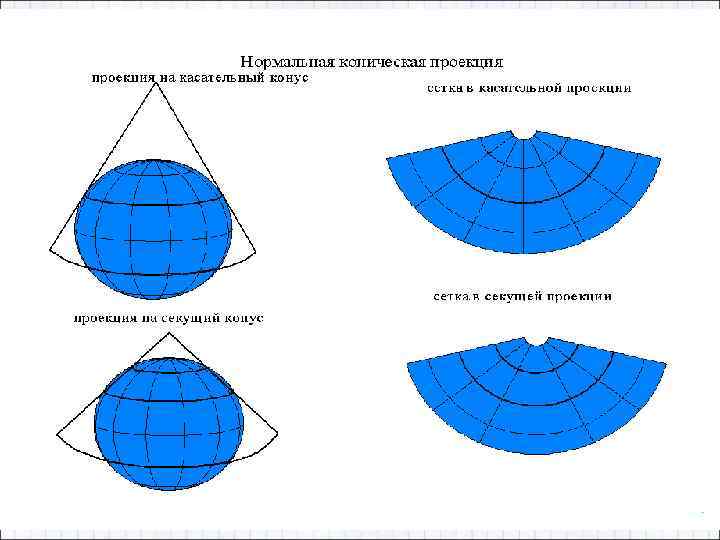 • Конические проекции - проекции, в которых параллели изображаются дугами концентрических окружностей, а меридианы – радиусами этих окружностей. В этих проекциях искажения не зависят от долготы. • Обычно используются для территорий, вытянутых в широтном направлении. Карты всей территории России часто составляются в равноугольных и равнопромежуточных конических проекциях.