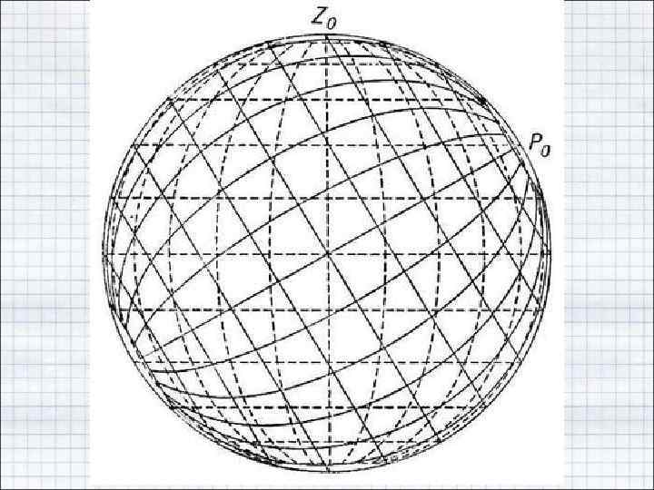 • Поэтому на сфере используют сферические координаты, координатные линии которых, так называемые вертикалы (условная долгота на них а = const) и альмукантараты (где полярные расстояния z = const), аналогичны географическим меридианам и параллелям, но их полюс Z 0 не совпадает с географическим полюсом P 0