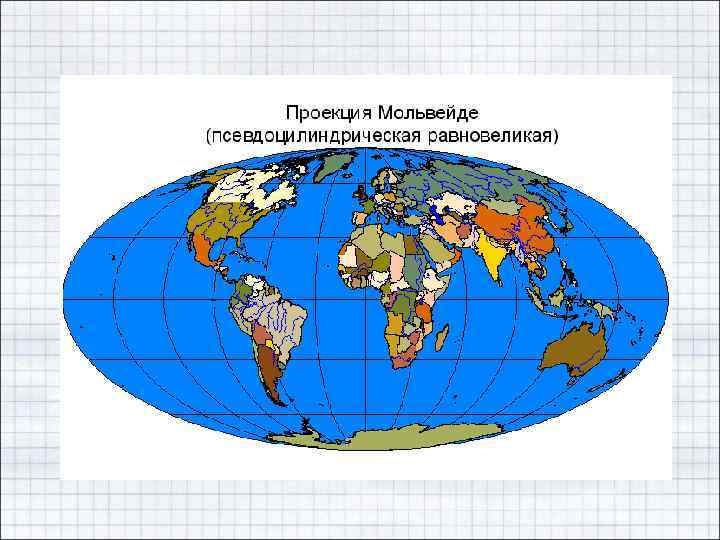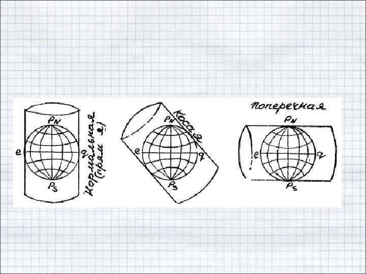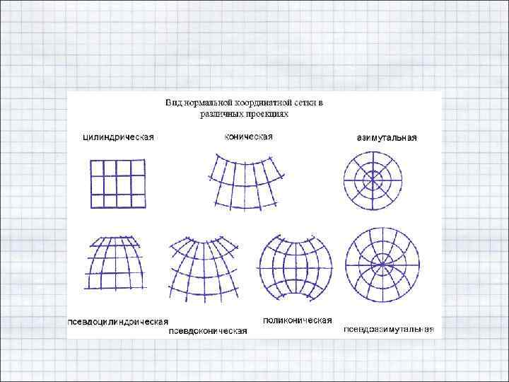 • виду нормальной сетки меридианов и параллелей – – – – азимутальные псевдоазимутальные цилиндрические псевдоцилиндрические конические псевдоконические поликонические
