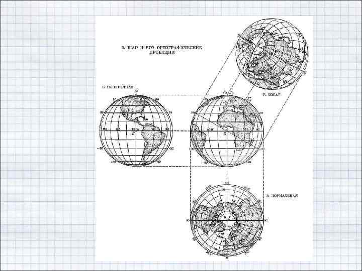 Классификация КП по положению полюса сферических координат. • Полюсы сферы - особые точки географической координации, хотя сфера в этих точках не имеет каких-либо особенностей. Значит, при картографировании областей, содержащих географические полюсы, желательно иногда применять не географические координаты, а другие, в которых полюсы оказываются обыкновенными точками координации.
