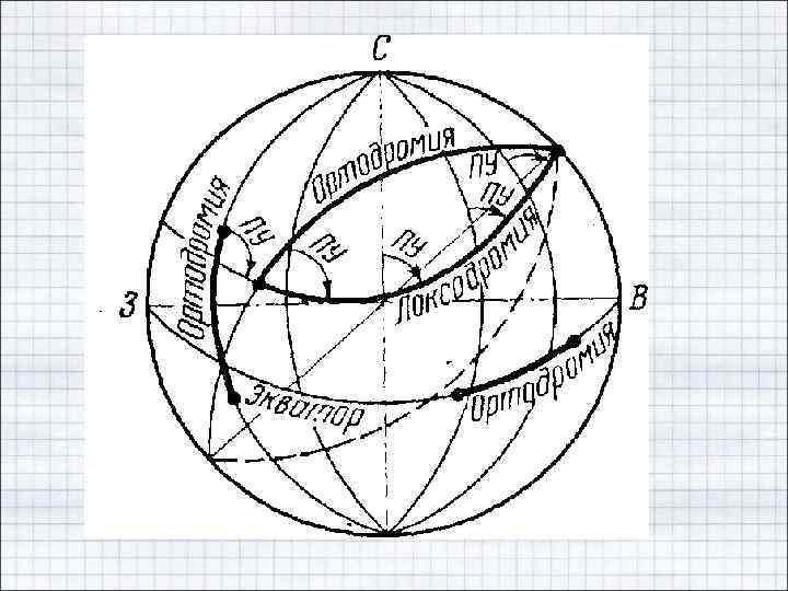 • Ортодромия - дуга большого круга, являющаяся кратчайшим расстоянием между двумя точками на поверхности земного шара. Ортодромия пересекает меридианы под различными углами. В частном случае она может совпадать с меридианом и экватором • Локсодромия-линия на поверхности земного шара, пересекающая меридианы под постоянным углом