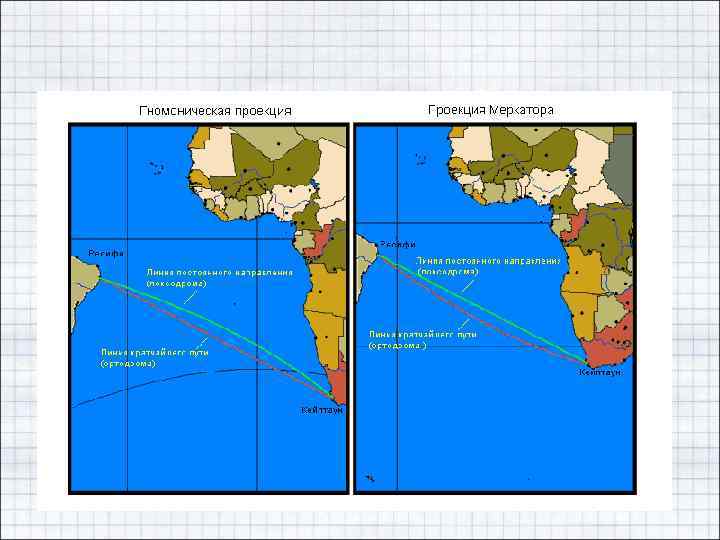 Примеры картографических проекций • Меркатора проекция - равноугольная цилиндрическая. Характеристическое свойство её - все локсодромии (линии на сфере, пересекающие все меридианы под одним и тем же углом) изображаются в М. п. прямыми, наклоненными к изображениям меридианов под тем же самым углом. • Широко используется в морской навигации и в аэронавигации. В этой проекции Меркатор создал первую многолистную карту Мира (1569), хотя сетки равноугольной цилиндрической проекции строились и до него