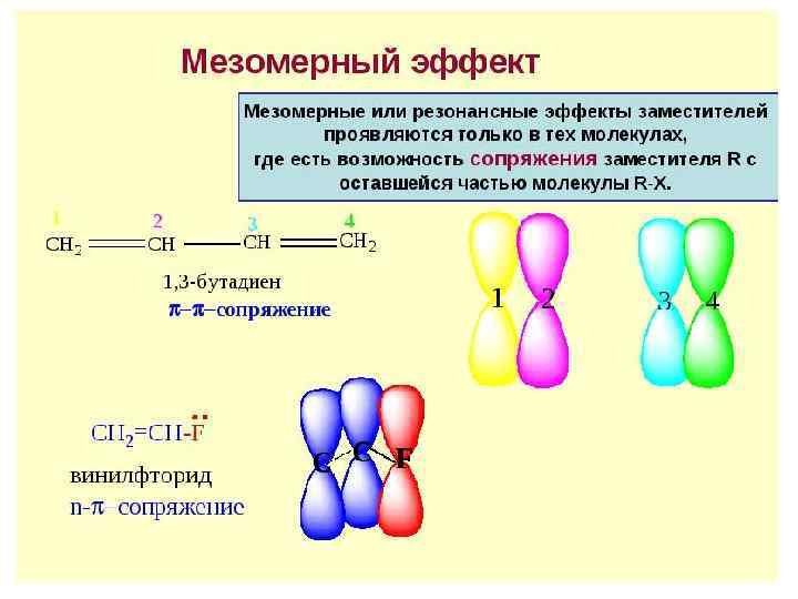 Смещение электронной плотности, передаваемое по цепи кратных связей, называют мезомерным эффектом, +М или - М. Мезомерный эффект (эффект сопряжения, резонансный эффект) — смещение электронной плотности химической связи по πсвязям. Мезомерный эффект объясняется теорией химического резонанса.