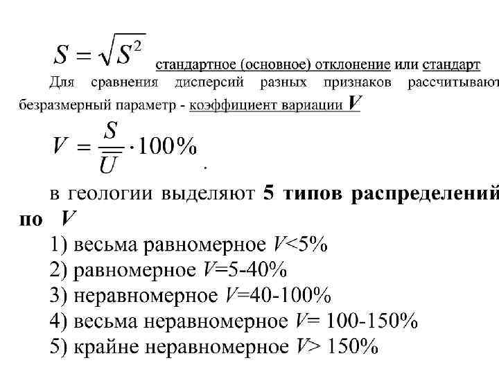 ОДНОМЕРНЫЕ СТАТИСТИЧЕСКИЕ МОДЕЛИ Одномерная статистическая модель - модель, характеризующая распределение какого-либо одного признака или свойства. В геологии одномерная статистическая модель используется при статистической обработке следующих данных: • замеров какого-либо морфологического параметра ископаемых организмов для их таксономической классификации в палеонтологии; • химических и минералогических анализов магматических горных пород для их классификации по содержанию петрогенных элементов, их окислов и породообразующих минералов; для выявления парагенетических ассоциаций минералов в петрографии; • гранулометрических анализов обломочных пород для их классификации по размерам обломков в литологии; • массовых замеров элементов залегания трещин, косой слоистости, ориентировки галек и т. п. для выявления преобладающих систем направлений при геологическом картировании; • химического опробования товарных руд для оценки их качества при разработке месторождений и т. д.