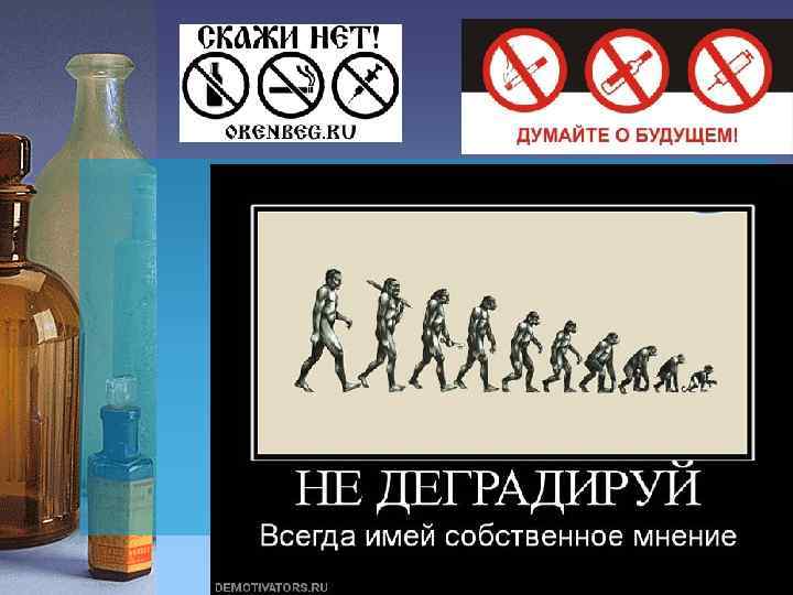 Правила 4 «НЕТ» 1. Постоянно вырабатывать в себе твердое «Нет!» любым психоактивным веществам (наркотическим и токсическим средствам), в любой дозе, какой бы она не была малой, в любой обстановке, в любой компании. Всегда только «Нет!» . 2. Формировать у себя умений в получении удовольствий при полезной ежедневной деятельности (хорошая учеба, занятия спортом, твердое «Нет!» безделью, скучной и неинтересной жизни, праздному времяпровождению. • 3. Умение правильно выбирать себе друзей и товарищей среди сверстников. Третье «Нет!» – тем сверстникам и той компании, где прием наркотиков – дело обыденное. • 4. Четвертое «Нет!» – своей стеснительности и неустойчивости, когда предлагают попробовать наркотик. Жизнь дороже! Трагедия наркоманов заключается в том, что они добровольно попали в рабскую зависимость от химических веществ. Добровольно пошли по пути лишения себя всех человеческих качеств.