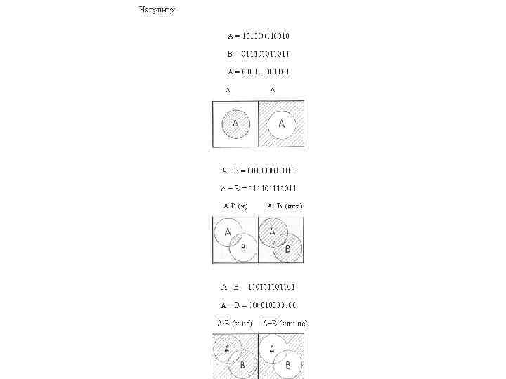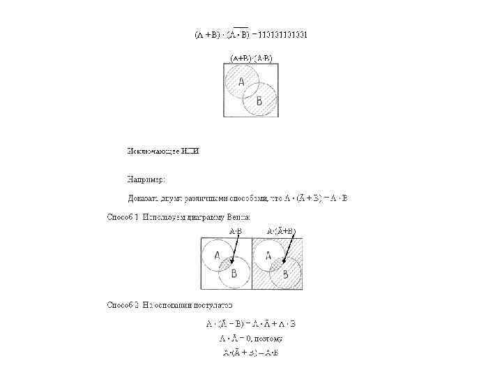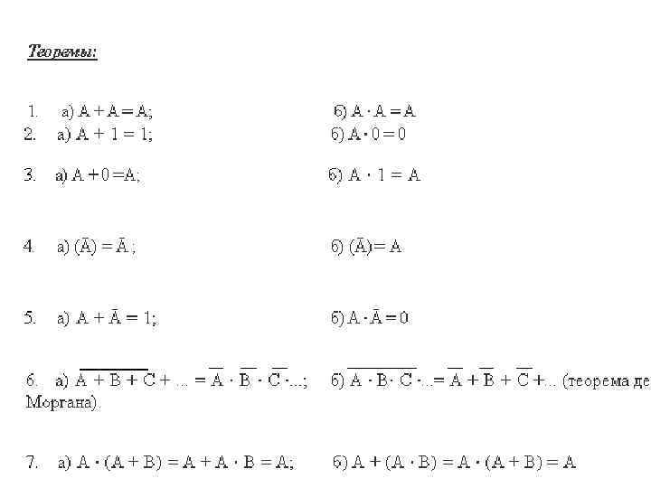 Основные постулаты алгебры логики. • Если подмножества А и В принадлежат множеству U, то и подмножество А и В (А · В) принадлежит этому множеству U. • Если подмножества А и В принадлежат множеству U, то и подмножество А или В (А + В) принадлежит этому множеству U. • Для всякого элемента А множества U имеется элемент 0, такой что А + 0 = А. • Для всякого элемента А множества U имеется элемент 1, такой что А · 1 = А. • Если А, В, С - элементы множества U, то а ) А + (В + С) = (В + А) + С = (А + С) + В и т. д. б) (А · В) · С = А · (В · С) и т. д. в)А + (В · С) = (А + В) · (А + С) - левое распределение относительно « + » . г) А · (В + С) = (А · В) + (А · С) - левое распределение относительно « · » . 6. Если 0 или 1 единственны, тогда для каждого элемента А множества U найдется такой элемент Ā этого же множества, что А · Ā = 0 и А + Ā = 1. 7. А, В и C таковы, что A ≠ B ≠ C.