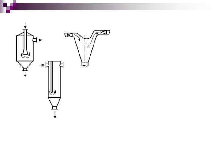 Прочие инерционные пылеуловители Недостатки: • Низкая эффективность в отношении частиц менее 20 мкм • Громоздкие Достоинства: • Простота Схема пылеуловителей: б – вихревые; а, в – инерционные
