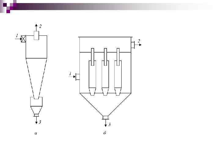 Циклоны Недостатки: • Низкая эффективность в отношении частиц менее 5 мкм • Прилипание • Износ абразивами Достоинства: • Высокая эффективность в отношении частиц более 20 мкм • Простота работы Циклоны: а – простые; б – батарейные. На входе в аппарат: 1 – запыленный газ; на выходе из аппарата: 2 – очищенный газ; 3 – пыль