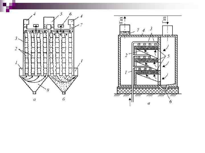 Рукавный фильтр: а) режим фильтрации; б) режим регенерации; 1 – газопровод запыленного газа; 2 – рукава; 3 – корпус; 4 – подвод продувочного воздуха; 5 – газопровод чистого газа; 6 – механизм встряхивания; 7 – клапан; 8 – бункер