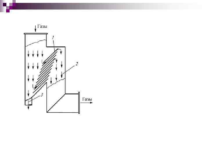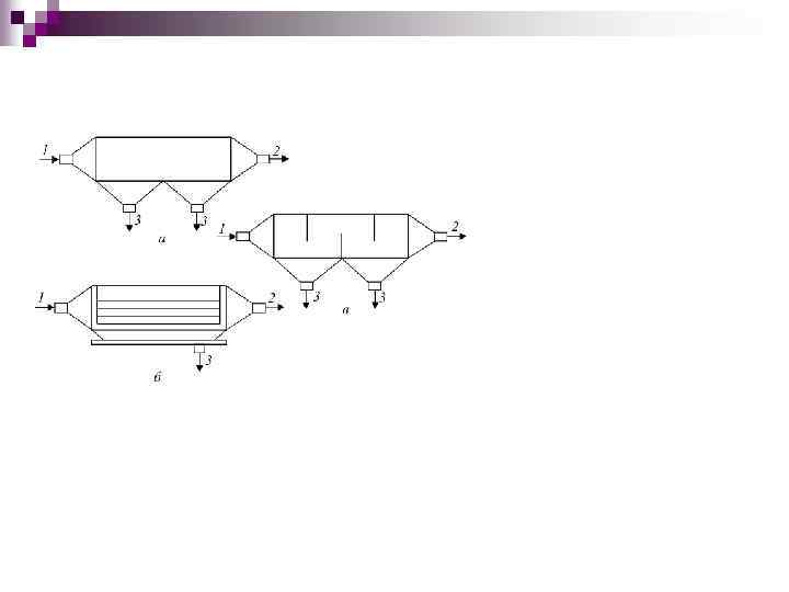 Пылеосадочные камеры Недостатки: • Размер • Трудоемкость очистки полок • Низкая эффективность в отношении частиц менее 40 мкм • Подсос воздуха Достоинства: • Дешевизна Типы пылеосадочных камер: а – полая; б – с горизонтальными полками; в – с вертикальными перегородками. На входе в аппарат: 1 – запыленный газ; на выходе из аппарата: 2 – очищенный газ; 3 – пыль