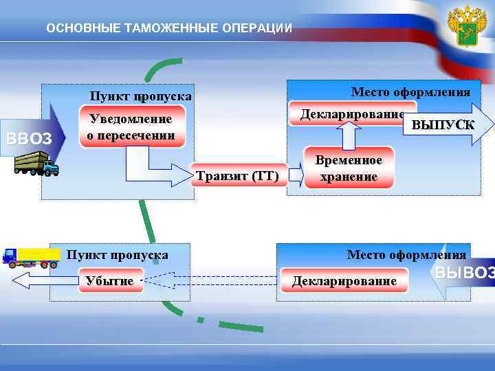 ОСНОВНЫЕ ТАМОЖЕННЫЕ ОПЕРАЦИИ Пункт пропуска Место оформления Уведомление Декларирование ВЫПУСК ВВОЗ о пересечении Временное Транзит (ТТ) хранение Пункт пропуска Место оформления Убытие Декларирование ВЫВОЗ