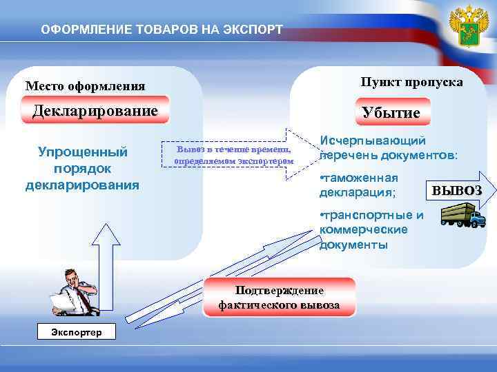ОФОРМЛЕНИЕ ТОВАРОВ НА ЭКСПОРТ Место оформления Пункт пропуска Декларирование Убытие Исчерпывающий Упрощенный Вывоз в течение времени, определяемом экспортером перечень документов: порядок • таможенная декларирования ВЫВОЗ декларация; • транспортные и коммерческие документы Подтверждение фактического вывоза Экспортер