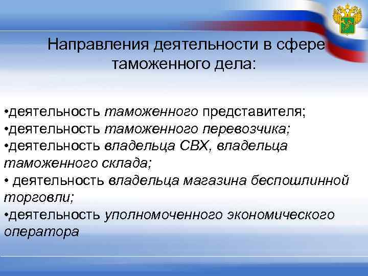 Направления деятельности в сфере таможенного дела: • деятельность таможенного представителя; • деятельность таможенного перевозчика; • деятельность владельца СВХ, владельца таможенного склада; • деятельность владельца магазина беспошлинной торговли; • деятельность уполномоченного экономического оператора