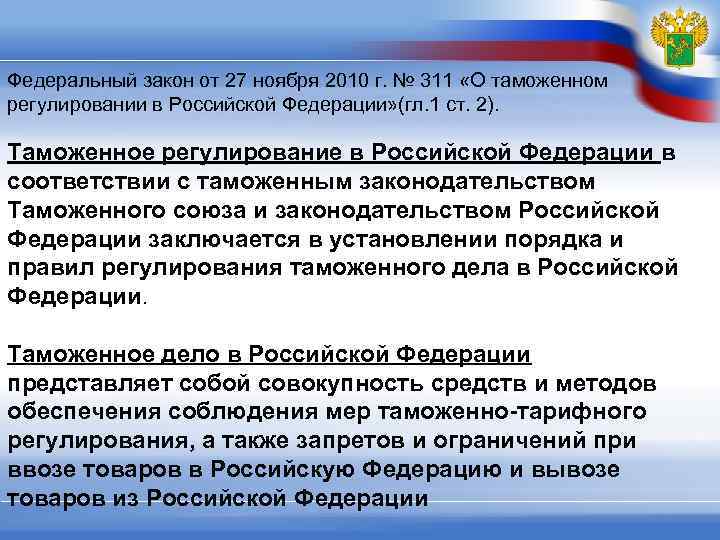 Федеральный закон от 27 ноября 2010 г. № 311 «О таможенном регулировании в Российской Федерации» (гл. 1 ст. 2). Таможенное регулирование в Российской Федерации в соответствии с таможенным законодательством Таможенного союза и законодательством Российской Федерации заключается в установлении порядка и правил регулирования таможенного дела в Российской Федерации. Таможенное дело в Российской Федерации представляет собой совокупность средств и методов обеспечения соблюдения мер таможенно-тарифного регулирования, а также запретов и ограничений при ввозе товаров в Российскую Федерацию и вывозе товаров из Российской Федерации