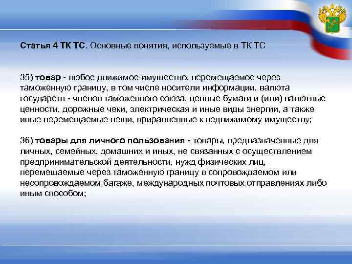 Статья 4 ТК ТС. Основные понятия, используемые в ТК ТС 35) товар - любое движимое имущество, перемещаемое через таможенную границу, в том числе носители информации, валюта государств - членов таможенного союза, ценные бумаги и (или) валютные ценности, дорожные чеки, электрическая и иные виды энергии, а также иные перемещаемые вещи, приравненные к недвижимому имуществу; 36) товары для личного пользования - товары, предназначенные для личных, семейных, домашних и иных, не связанных с осуществлением предпринимательской деятельности, нужд физических лиц, перемещаемые через таможенную границу в сопровождаемом или несопровождаемом багаже, международных почтовых отправлениях либо иным способом;