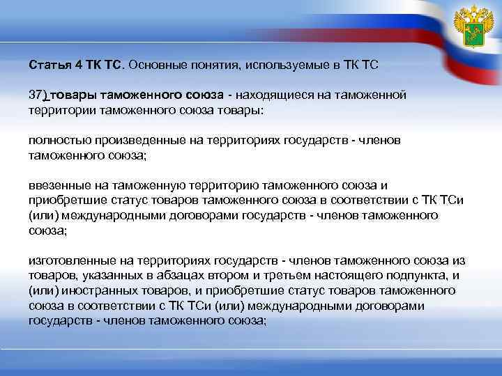 Статья 4 ТК ТС. Основные понятия, используемые в ТК ТС 37) товары таможенного союза - находящиеся на таможенной территории таможенного союза товары: полностью произведенные на территориях государств - членов таможенного союза; ввезенные на таможенную территорию таможенного союза и приобретшие статус товаров таможенного союза в соответствии с ТК ТСи (или) международными договорами государств - членов таможенного союза; изготовленные на территориях государств - членов таможенного союза из товаров, указанных в абзацах втором и третьем настоящего подпункта, и (или) иностранных товаров, и приобретшие статус товаров таможенного союза в соответствии с ТК ТСи (или) международными договорами государств - членов таможенного союза;