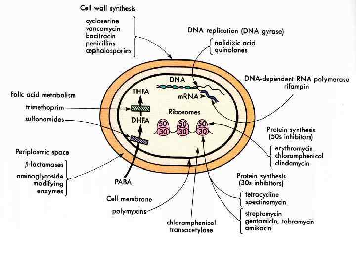 3. СРЕДСТВА, НАРУШАЮЩИЕ ФУНКЦИЮ СУБЪЕДИНИЦ 30 S И 50 S РИБОСОМ (обратимые ингибиторы синтеза белка) - тетрациклины - хлорамфеникол (левомицетин) - эритромицин - клиндамицин 4. СРЕДСТВА, СВЯЗЫВАЮЩИЕСЯ С 30 S СУБЪЕДИНИЦЕЙ РИБОСОМ - аминогликозиды 5. СРЕДСТВА, НАРУШАЮЩИЕ МЕТАБОЛИЗМ НУКЛЕИНОВЫХ КИСЛОТ - рифампицин - фторхинолоны