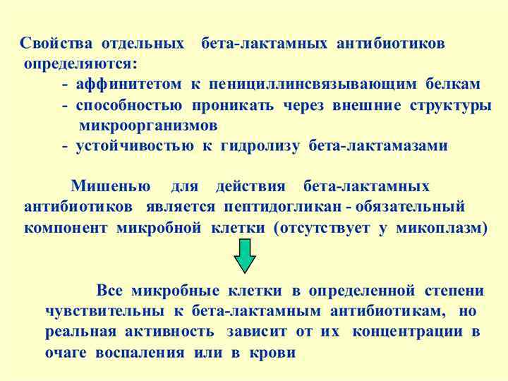 КЛАССИФИКАЦИЯ ПЕНИЦИЛЛИНОВ 1. Природные - бензилпенициллин - феноксиметилпенициллин 2. Полусинтетические Пенициллиназо- ( метициллин) стабильные - оксациллин - клоксациллин Аминопенициллины - ампициллин - амоксициллин Карбоксипенициллины - карбенициллин - тикарциллин Уреидопенициллины - азлоциллин - мезлоциллин