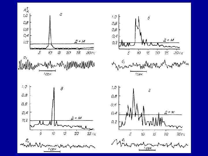 Альфа-ритм (8 -13 Гц, 25 -75 мк. В) – семейство ритмов, возникающих в разных корковых областях: 1. Классический затылочный (зрительный) альфа-ритм. 2. Центральный (сенсомоторный) мюритм.