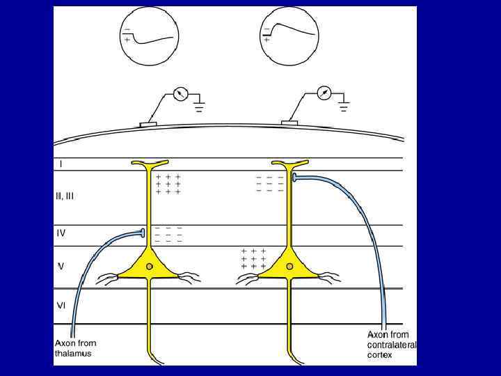 В коре существуют возбуждающие (звездчатые и пирамидные), а также тормозные нейроны. Все эти клетки получают входы от таламуса. Пирамидные клетки — основные в генерации ЭЭГ. Они расположены упорядоченно и вертикально.