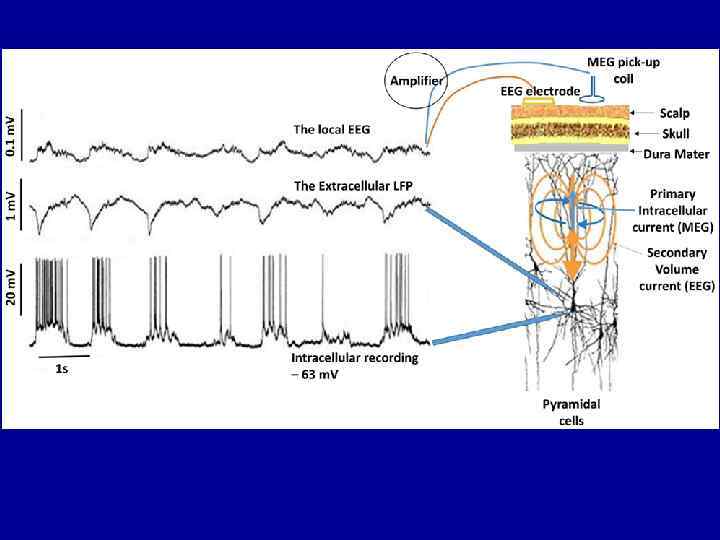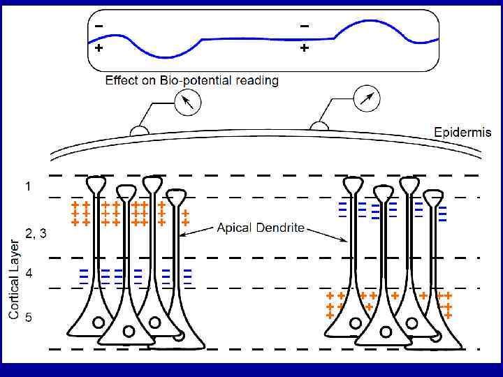 Пирамидная клетка – диполь. Диполь постоянно перезаряжается - "+" и "-" меняются местами. Причиной этого являются ВПСП и ТПСП