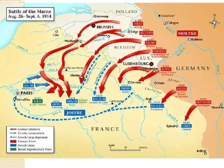 Битва на Марне 5— 12 сентября 1914 г. 4 сентября генерал Жоффр издал директиву на наступление. 5 сентября 6 -я французская армия нанесла удар во фланг и тыл 1 -й германской армии. 6 сентября по всему фронту грянуло сражение. 7 сентября фон Клюк с Марны перебросил ещё две дивизии В поддержку двум корпусам 1 -й армии, сражавшимся против 6 -й армии