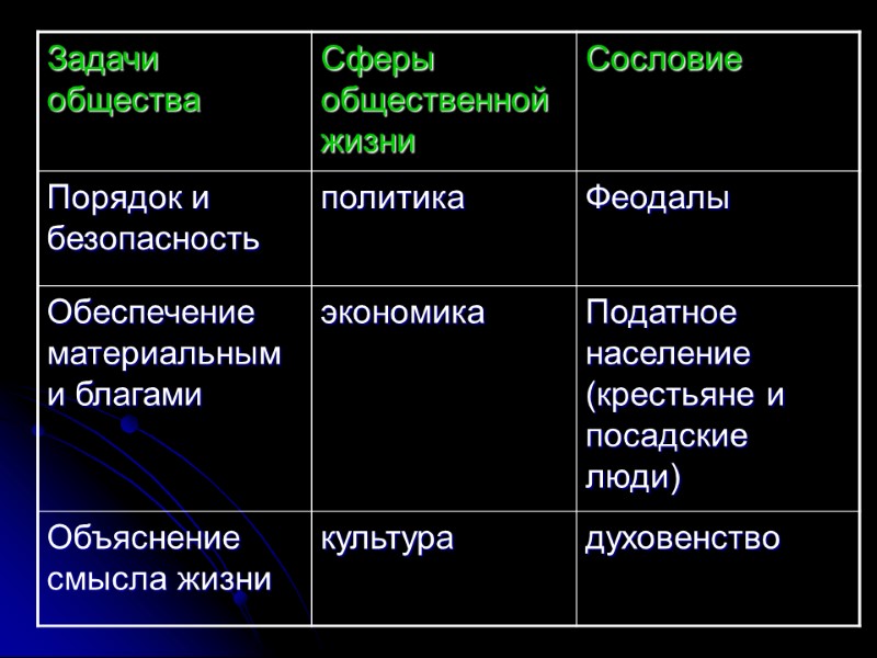 Дворяне : Обязанности: Управлять и защищать- Права: - владели поместьем пожизненно, пока мог нести военную службу; - поместье передавалось по наследству, если сын ко времени смерти отца достигал 15 лет и мог служить государству.