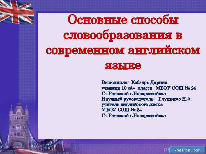 Основные способы словообразования в современном английском языке Выполнила: Кобзарь Дарина ученица 10 «А» класса МБОУ СОШ № 24 Ст. Раевской г. Новороссийска Научный руководитель: Глушенко Н. А. учитель английского языка МБОУ СОШ № 24 Ст. Раевской г. Новороссийска Prezentacii. com