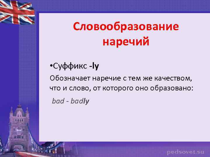 Словообразование наречий • Суффикс -ly Обозначает наречие с тем же качеством, что и слово, от которого оно образовано: bad - badly
