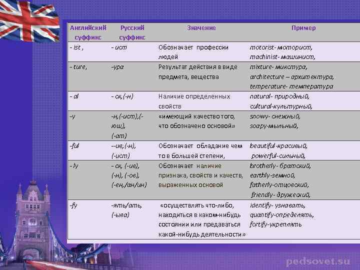 Английский Русский суффикс - ist , - ист - ture, -ура - al - ск, (-н) -y -н, (-ист), (ющ), (-ат) --ив, (-н), (-ист) - ск, (-ив), (-н), (-ов), (-ен, /ан/ин) -ful - ly -fy -ять/ать, (-ыва) Значение Обозначает профессии людей Результат действия в виде предмета, вещества Наличие определенных свойств «имеющий качество того, что обозначено основой» Обозначает обладание чем то в большей степени, Обозначает наличие признака, свойств и качеств, выраженных основой Пример motorist- моторист, machinist- машинист, mixture- микстура, architecture – архитектура, temperature- температура natural- природный, cultural-культурный, snowy- снежный, soapy-мыльный, beautiful-красивый, powerful-сильный, brotherly- братский, earthly-земной, fatherly-отцовский, friendly- дружеский, «осуществлять что-либо, identify- узнавать, находиться в каком-нибудь quantify-определять, состоянии или предаваться fortify-укреплять какой-нибудь деятельности»