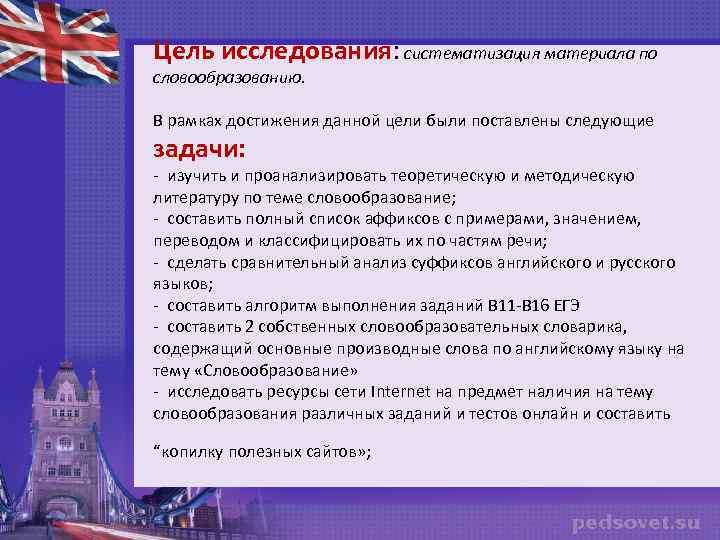 Цель исследования: систематизация материала по словообразованию. В рамках достижения данной цели были поставлены следующие задачи: - изучить и проанализировать теоретическую и методическую литературу по теме словообразование; - составить полный список аффиксов с примерами, значением, переводом и классифицировать их по частям речи; - сделать сравнительный анализ суффиксов английского и русского языков; - составить алгоритм выполнения заданий В 11 -В 16 ЕГЭ - составить 2 собственных словообразовательных словарика, содержащий основные производные слова по английскому языку на тему «Словообразование» - исследовать ресурсы сети Internet на предмет наличия на тему словообразования различных заданий и тестов онлайн и составить “копилку полезных сайтов» ;