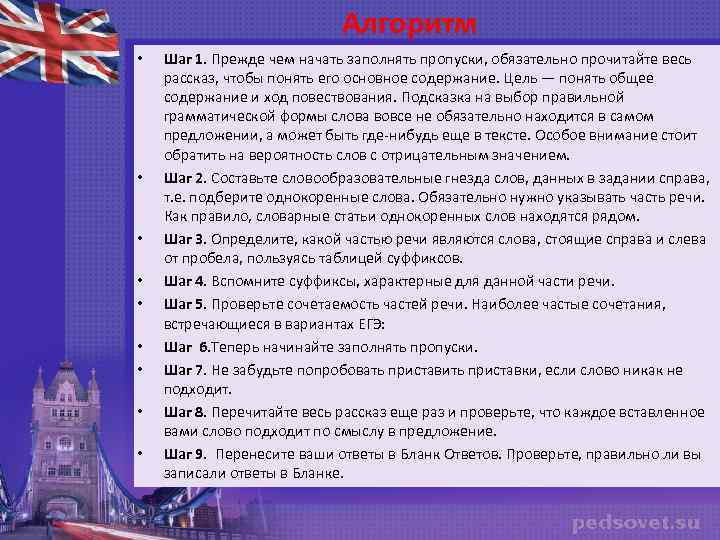 Алгоритм • • • Шаг 1. Прежде чем начать заполнять пропуски, обязательно прочитайте весь рассказ, чтобы понять его основное содержание. Цель — понять общее содержание и ход повествования. Подсказка на выбор правильной грамматической формы слова вовсе не обязательно находится в самом предложении, а может быть где-нибудь еще в тексте. Особое внимание стоит обратить на вероятность слов с отрицательным значением. Шаг 2. Составьте словообразовательные гнезда слов, данных в задании справа, т. е. подберите однокоренные слова. Обязательно нужно указывать часть речи. Как правило, словарные статьи однокоренных слов находятся рядом. Шаг 3. Определите, какой частью речи являются слова, стоящие справа и слева от пробела, пользуясь таблицей суффиксов. Шаг 4. Вспомните суффиксы, характерные для данной части речи. Шаг 5. Проверьте сочетаемость частей речи. Наиболее частые сочетания, встречающиеся в вариантах ЕГЭ: Шаг 6. Теперь начинайте заполнять пропуски. Шаг 7. Не забудьте попробовать приставить приставки, если слово никак не подходит. Шаг 8. Перечитайте весь рассказ еще раз и проверьте, что каждое вставленное вами слово подходит по смыслу в предложение. Шаг 9. Перенесите ваши ответы в Бланк Ответов. Проверьте, правильно ли вы записали ответы в Бланке.