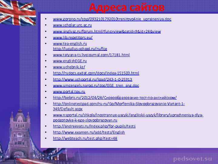 Адреса сайтов • • • • • www. gorono. ru/cop/0932101792010 trenirovo 4 nie_uprajneniya. doc www. scholar. urc. ac. ru www. anglyaz. ru/forum. html? func=view&catid=9&id=28&view www. lib. repetitors. eu/ www. tea-english. ru http: //lucullus-school. ru/ru/fce www. tatyana-ts. livejournal. com/17181. html www. english. EGE. ru www. uchebnik. kz/ http: //rudocs. exdat. com/docs/index-151503. html http: //www. uchportal. ru/load/243 -1 -0 -25913 www. umcengels. narod. ru/doc/EGE_tren_ang. doc www. portal. tpu. ru http: //bebris. ru/2012/04/28/Словообразование-тест-по-английском/ http: //onlinetestpad. com/ru-ru/Go/Morfemika-Slovoobrazovanie-Variant-1349/Default. aspx www. nsportal. ru/shkola/inostrannye-yazyki/angliiskii-yazyk/library/uprazhneniya-dlyapodgotovke-k-ege-slovoobrazovan. ru http: //andreevats. ru/index. php/for-pupils/tests http: //www. examen. ru/add/tests/English http: //webteach. ru/test. php? test=48