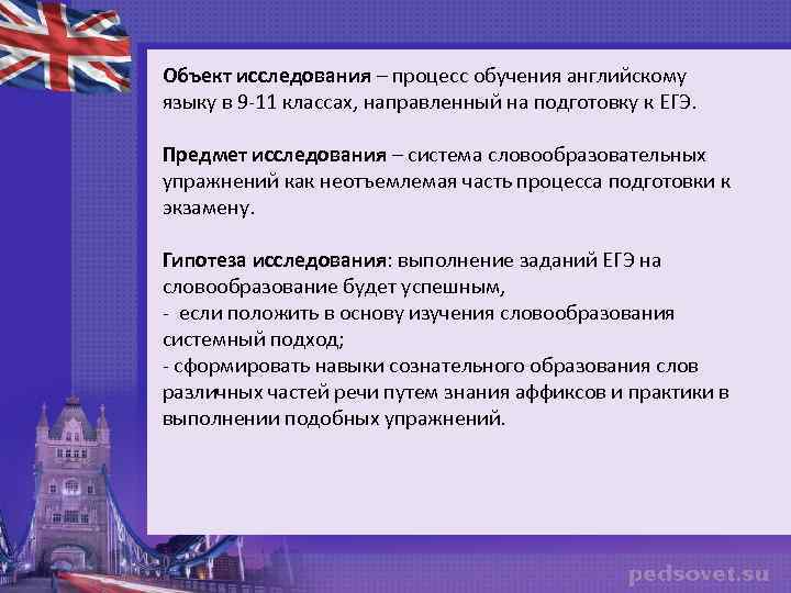 Объект исследования – процесс обучения английскому языку в 9 -11 классах, направленный на подготовку к ЕГЭ. Предмет исследования – система словообразовательных упражнений как неотъемлемая часть процесса подготовки к экзамену. Гипотеза исследования: выполнение заданий ЕГЭ на словообразование будет успешным, - если положить в основу изучения словообразования системный подход; - сформировать навыки сознательного образования слов различных частей речи путем знания аффиксов и практики в выполнении подобных упражнений.