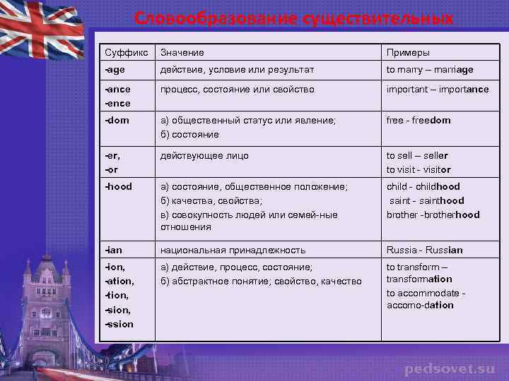 Словообразование существительных Суффикс Значение Примеры -age действие, условие или результат to marry – marriage -ance -ence процесс, состояние или свойство important – importance -dom а) общественный статус или явление; б) состояние free - freedom -er, -or действующее лицо to sell – seller to visit - visitor -hood а) состояние, общественное положение; б) качества, свойства; в) совокупность людей или семей-ные отношения child - childhood saint - sainthood brother -brotherhood -ian национальная принадлежность Russia - Russian -ion, -ation, -sion, -ssion а) действие, процесс, состояние; б) абстрактное понятие; свойство, качество to transform – transformation to accommodate - accomo-dation