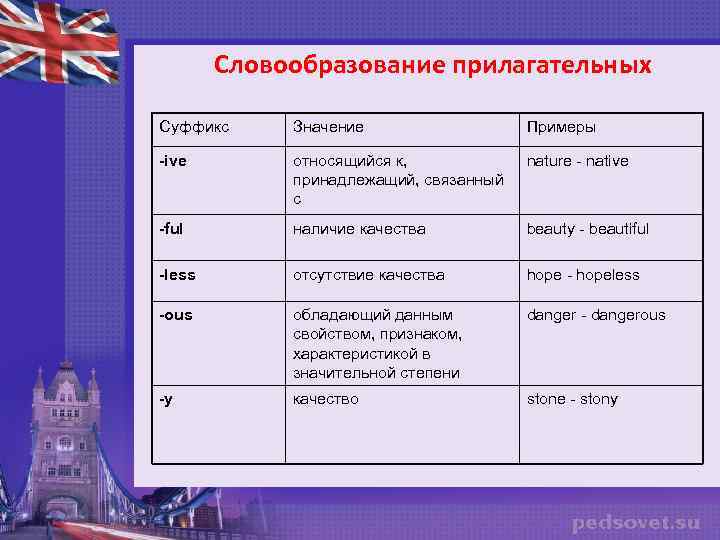 Словообразование прилагательных Суффикс Значение Примеры -ive относящийся к, принадлежащий, связанный с nature - native -ful наличие качества beauty - beautiful -less отсутствие качества hope - hopeless -ous обладающий данным свойством, признаком, характеристикой в значительной степени danger - dangerous -y качество stone - stony
