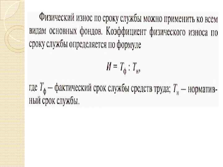 Физический и моральный износ основных средств Под физическим износом понимается потеря средствами труда своих первоначальных качеств. Уровень физического износа основных средств зависит от: первоначального качества основных средств; степени их эксплуатации; уровня агрессивности среды, в которой функционируют основные средства; уровня квалификации обслуживающего персонала; своевременности проведения ТО, ремонта и др.
