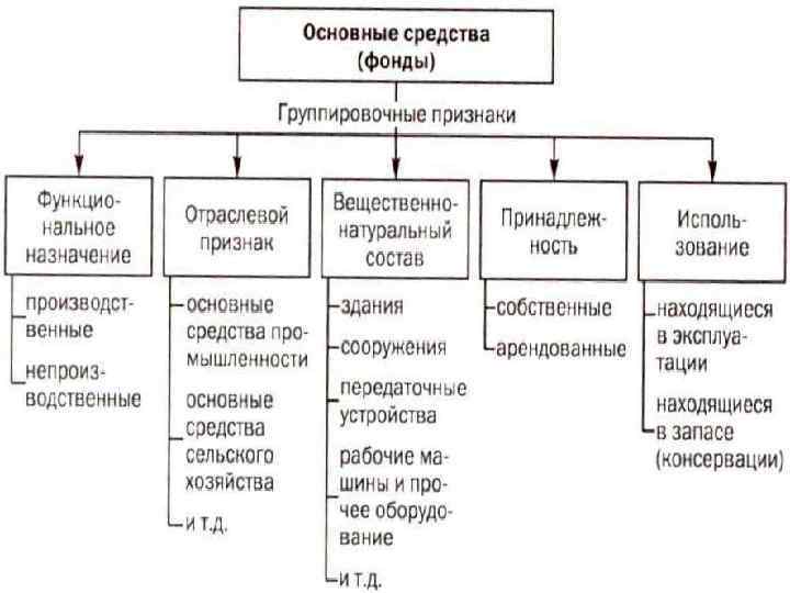 Основные средства делятся на: производственные основные фонды – те средства труда, которые непосредственно участвуют в производственном процессе (машины, оборудование и т. п. ), создают условия для его нормального осуществления (производственные здания, сооружения, электросети и др. ) и служат для хранения и перемещения предметов труда; непроизводственные основные фонды это основные фонды, которые непосредственно не участвуют в производственном процессе (жилые дома, детские сады и ясли, школы, больницы и др. ), но находящиеся в ведении промышленных предприятий.