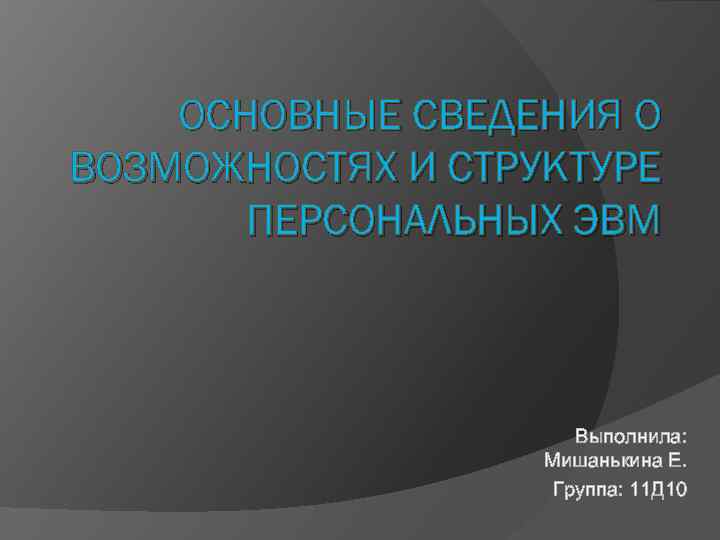 ОСНОВНЫЕ СВЕДЕНИЯ О ВОЗМОЖНОСТЯХ И СТРУКТУРЕ ПЕРСОНАЛЬНЫХ ЭВМ Выполнила: Мишанькина Е. Группа: 11 Д 10