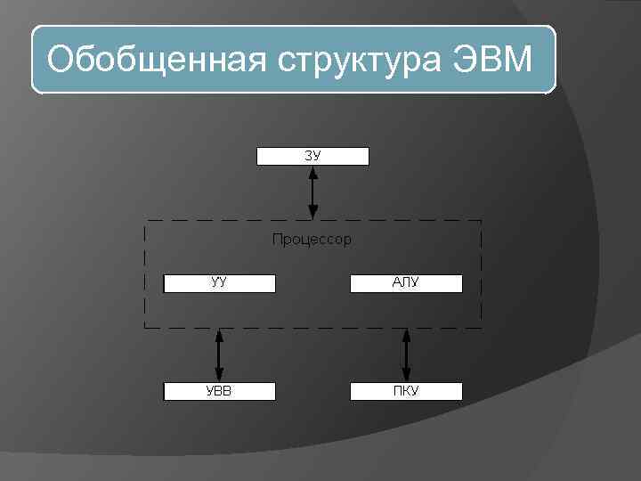 Состав ЭВМ В состав ЭВМ входят: Оперативное запоминающее устройство (ОЗУ, более короткое обозначение-оперативная память ОП); Процессор; Устройство ввода- вывода (УВВ, другое обозначение- периферийное устройство. ПУ); Пульт контроля и управления (ПКУ). Процессор предназначен для обработки информации. Он состоит из 2 -х частей: УУ - устройство управления (управляющий автомат), и АЛУ арифметико-логическое устройство.