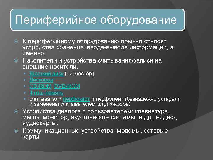 Периферийное оборудование К периферийному оборудованию обычно относят устройства хранения, ввода-вывода информации, а именно: Накопители и устройства считывания/записи на внешние носители. Жесткий диск (винчестер) Дисковод CD-ROM, DVD-ROM Флэш-память считыватели перфокарт и перфолент (безнадежно устарели и заменены считывателем штрих-кодов) Устройства диалога с пользователем: клавиатура, мышь, монитор, акустические системы, и др. , видео-, аудиокарты. Коммуникационные устройства: модемы, сетевые карты