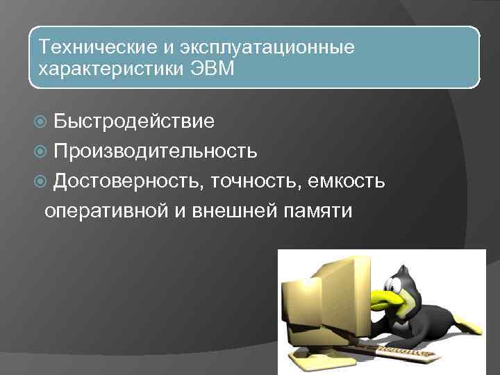 Технические и эксплуатационные характеристики ЭВМ Быстродействие Производительность Достоверность, точность, емкость оперативной и внешней памяти