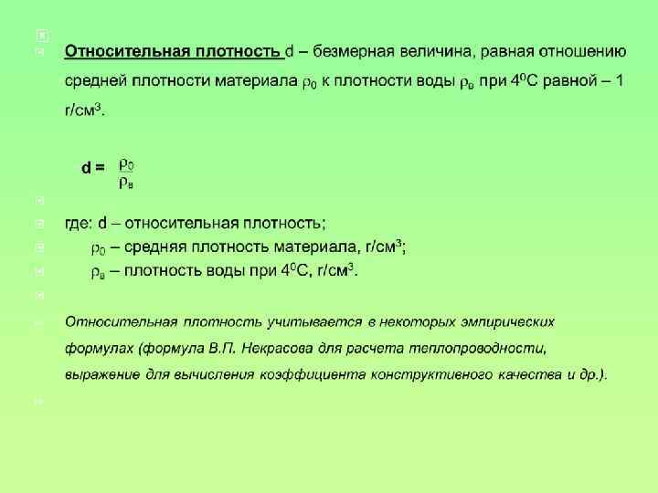 Физические свойства Истинная плотность 0 (r/см 3) – масса единицы объема материала в абсолютно плотном состоянии (без пор и пустот) определяются по формуле: m / Vа где: m – масса материала, r; Vа – объем материала в абсолютно плотном состоянии (без пор и пустот), см 3. Va = V – Vn V – объем материала в естественном состоянии, см 3 Vn – объем пор в материале, см 3.