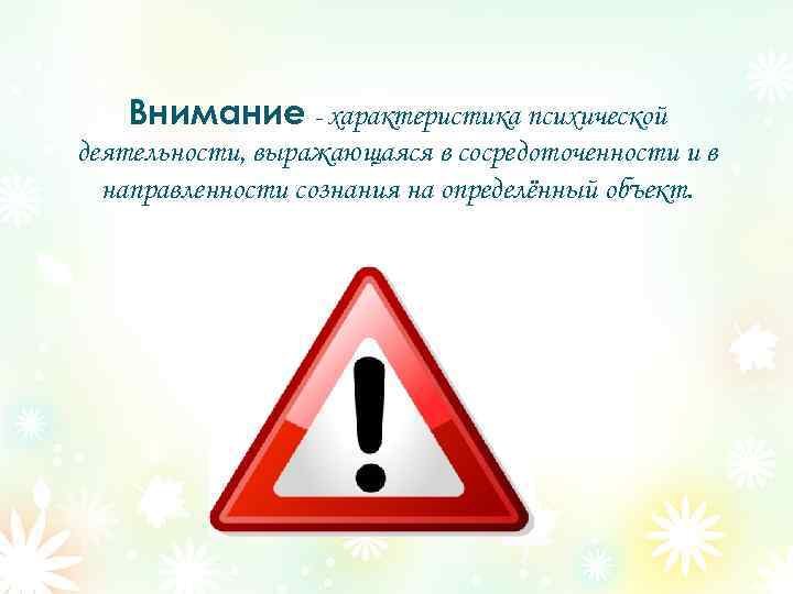 Внимание - характеристика психической деятельности, выражающаяся в сосредоточенности и в направленности сознания на определённый объект.