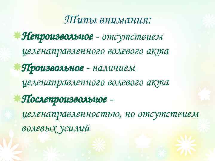 Типы внимания: Непроизвольное - отсутствием целенаправленного волевого акта Произвольное - наличием целенаправленного волевого акта Послепроизвольное целенаправленностью, но отсутствием волевых усилий