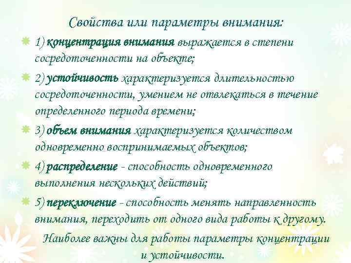 Свойства или параметры внимания: 1) концентрация внимания выражается в степени сосредоточенности на объекте; 2) устойчивость характеризуется длительностью сосредоточенности, умением не отвлекаться в течение определенного периода времени; 3) объем внимания характеризуется количеством одновременно воспринимаемых объектов; 4) распределение - способность одновременного выполнения нескольких действий; 5) переключение - способность менять направленность внимания, переходить от одного вида работы к другому. Наиболее важны для работы параметры концентрации и устойчивости.