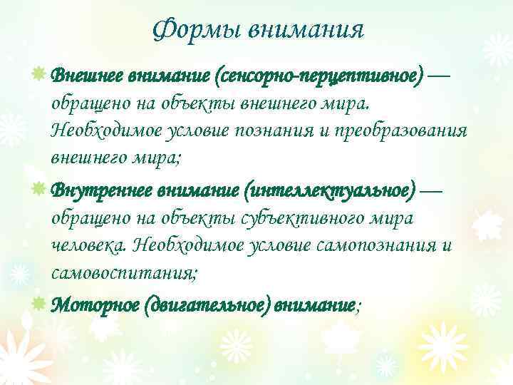 Формы внимания Внешнее внимание (сенсорно-перцептивное) — обращено на объекты внешнего мира. Необходимое условие познания и преобразования внешнего мира; Внутреннее внимание (интеллектуальное) — обращено на объекты субъективного мира человека. Необходимое условие самопознания и самовоспитания; Моторное (двигательное) внимание;